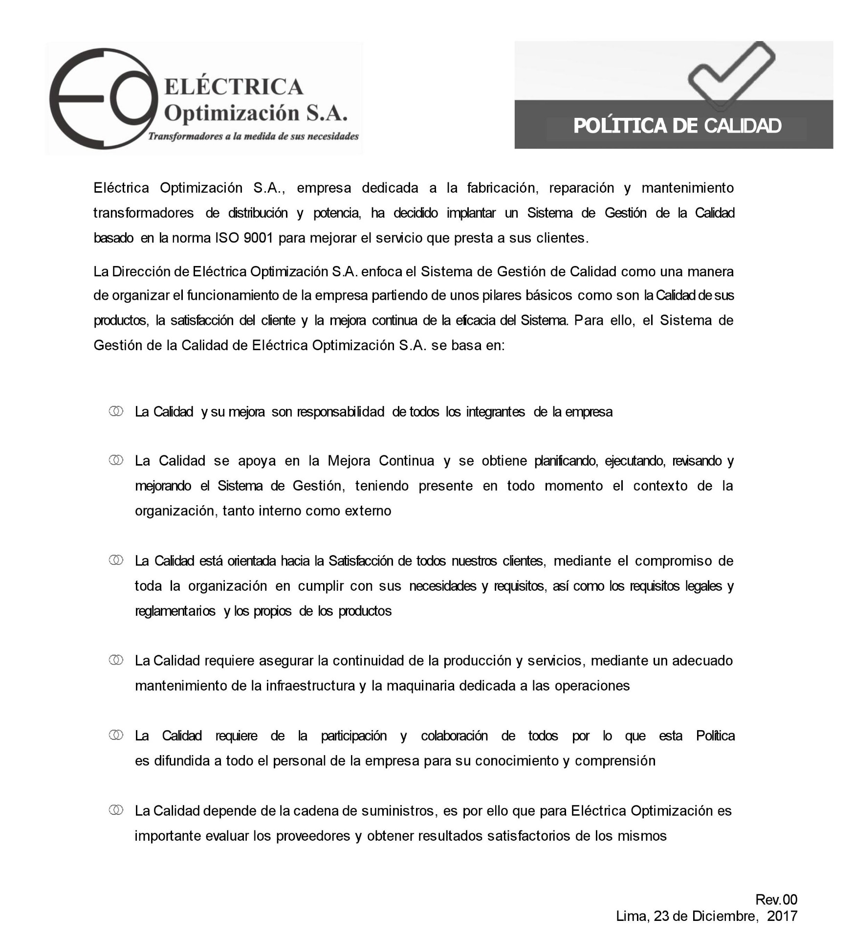 De acuerdo a la norma ISO 9001:2015, ponemos a disposición de todas nuestras partes interesadas nuestra política de calidad